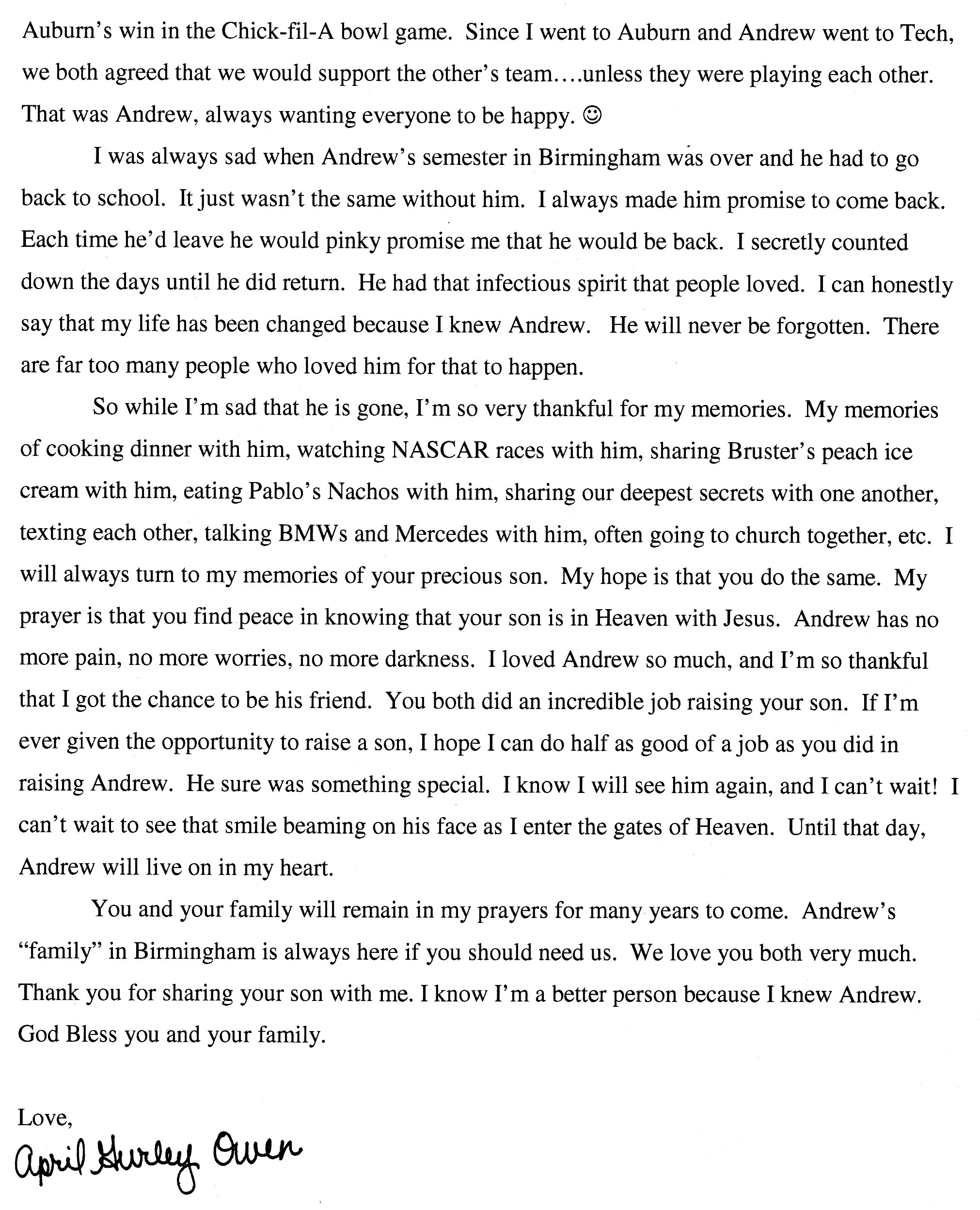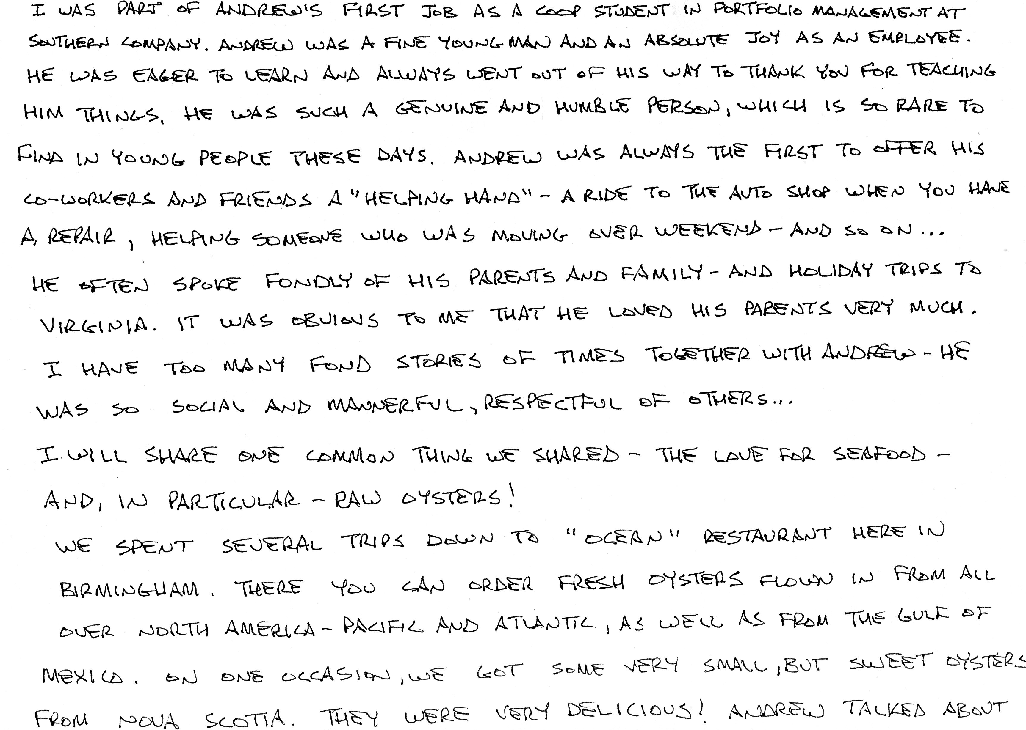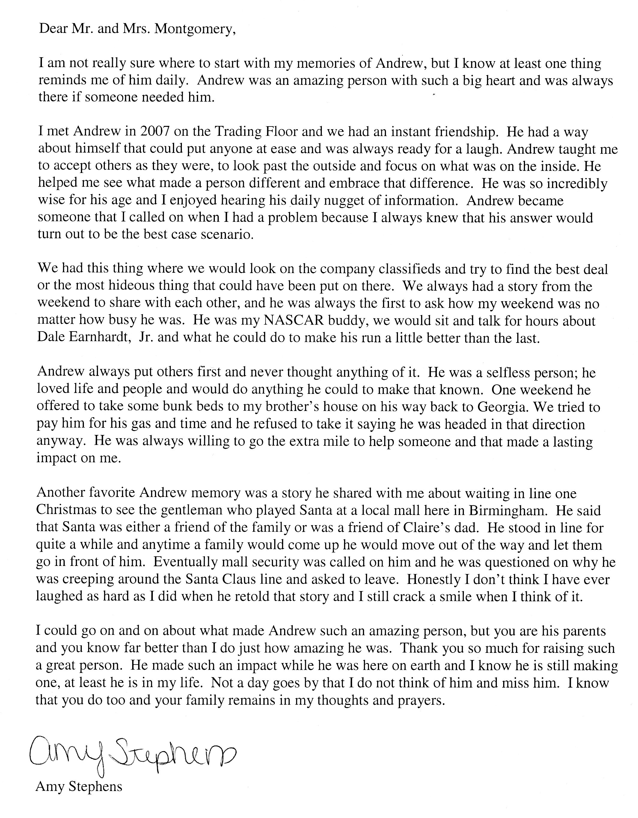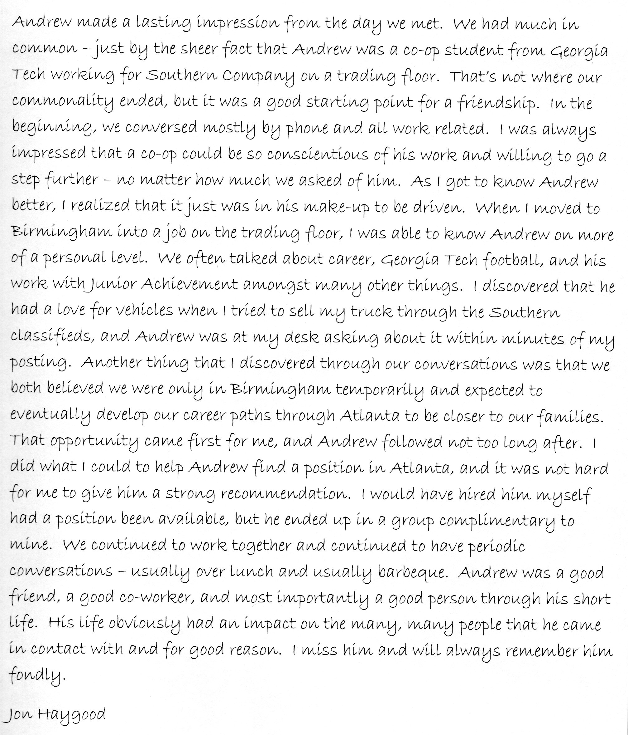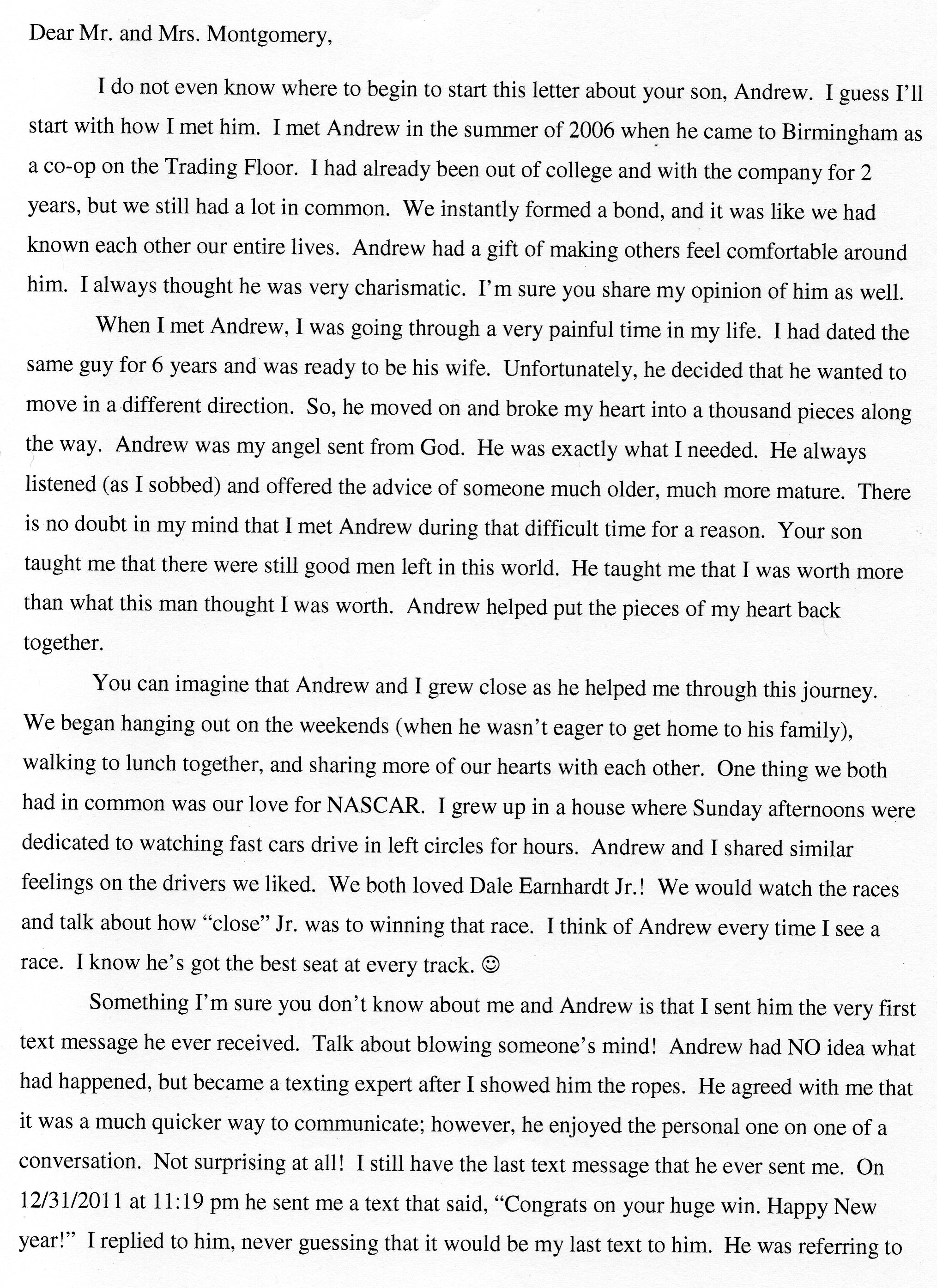 | This Web site - LoveToAndrew.com - was inspired by the "memory book" put together by Andrew's coworkers at Southern Company. We his parents, Mary Elizabeth and Andy Montgomery, hope that this site brings comfort to Andrew's friends and family members as it has to us. The memories in this book reveal that Andrew was a blessing to many. If you desire to comment or offer postings for the site, please email AndyMont@awmLAND.com or MESloop@awmLAND.com. |