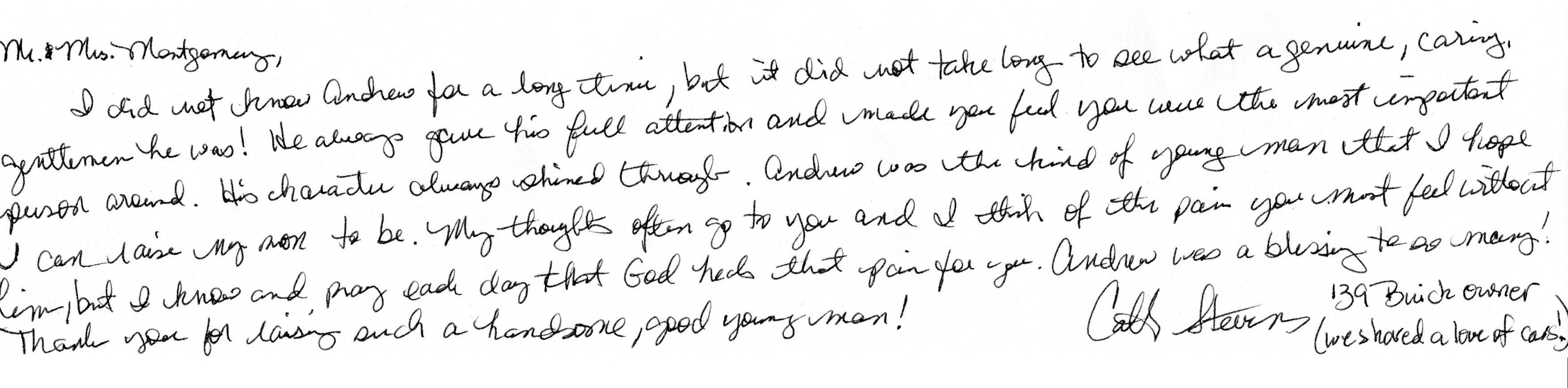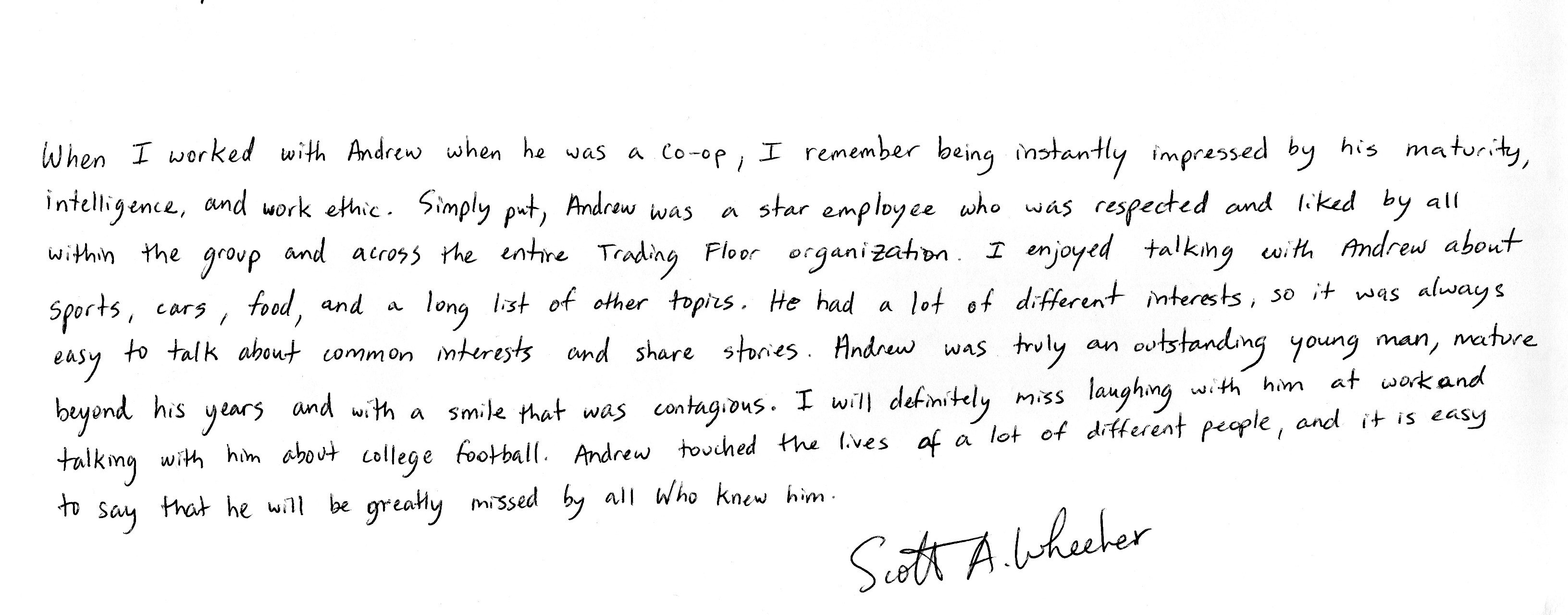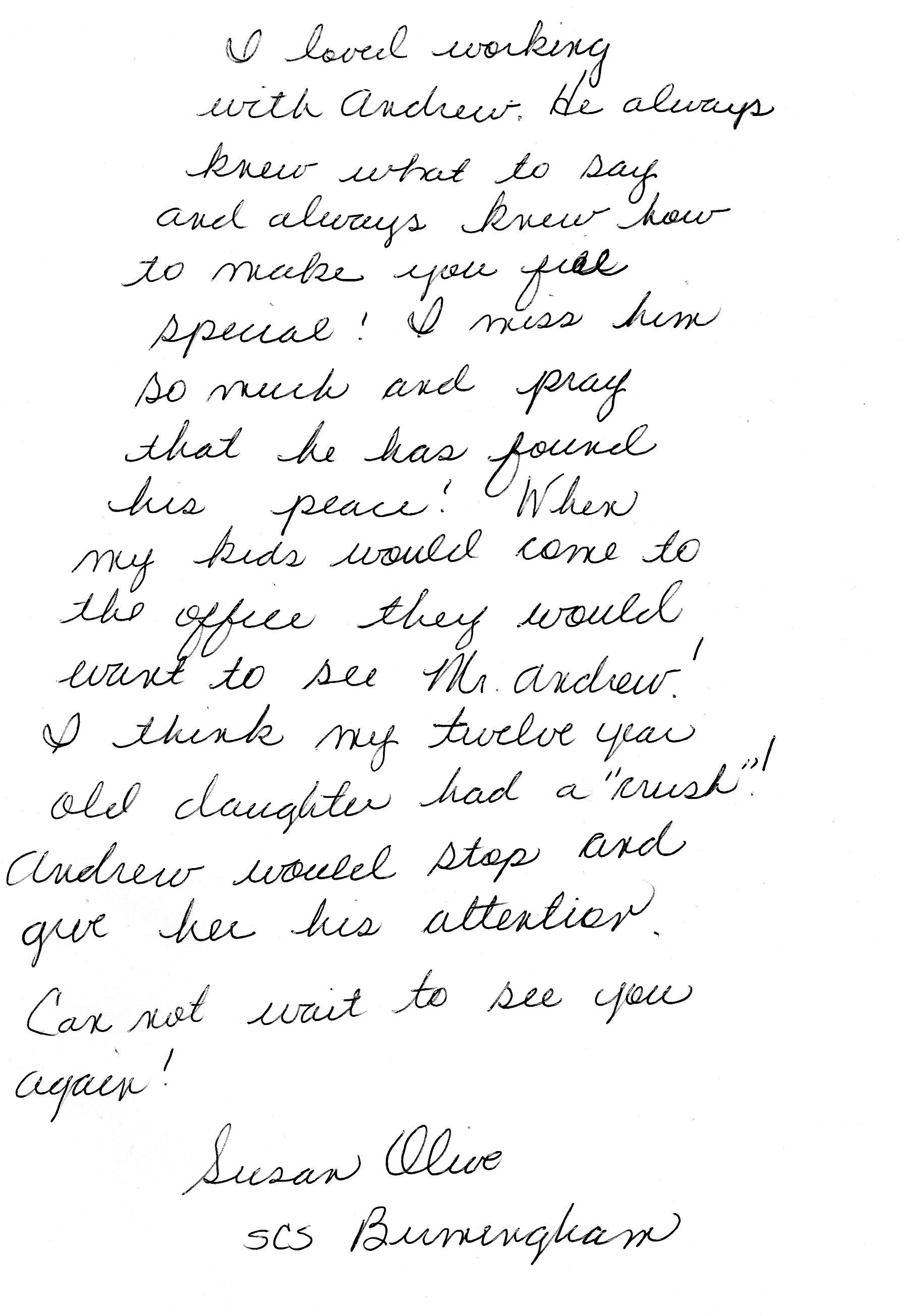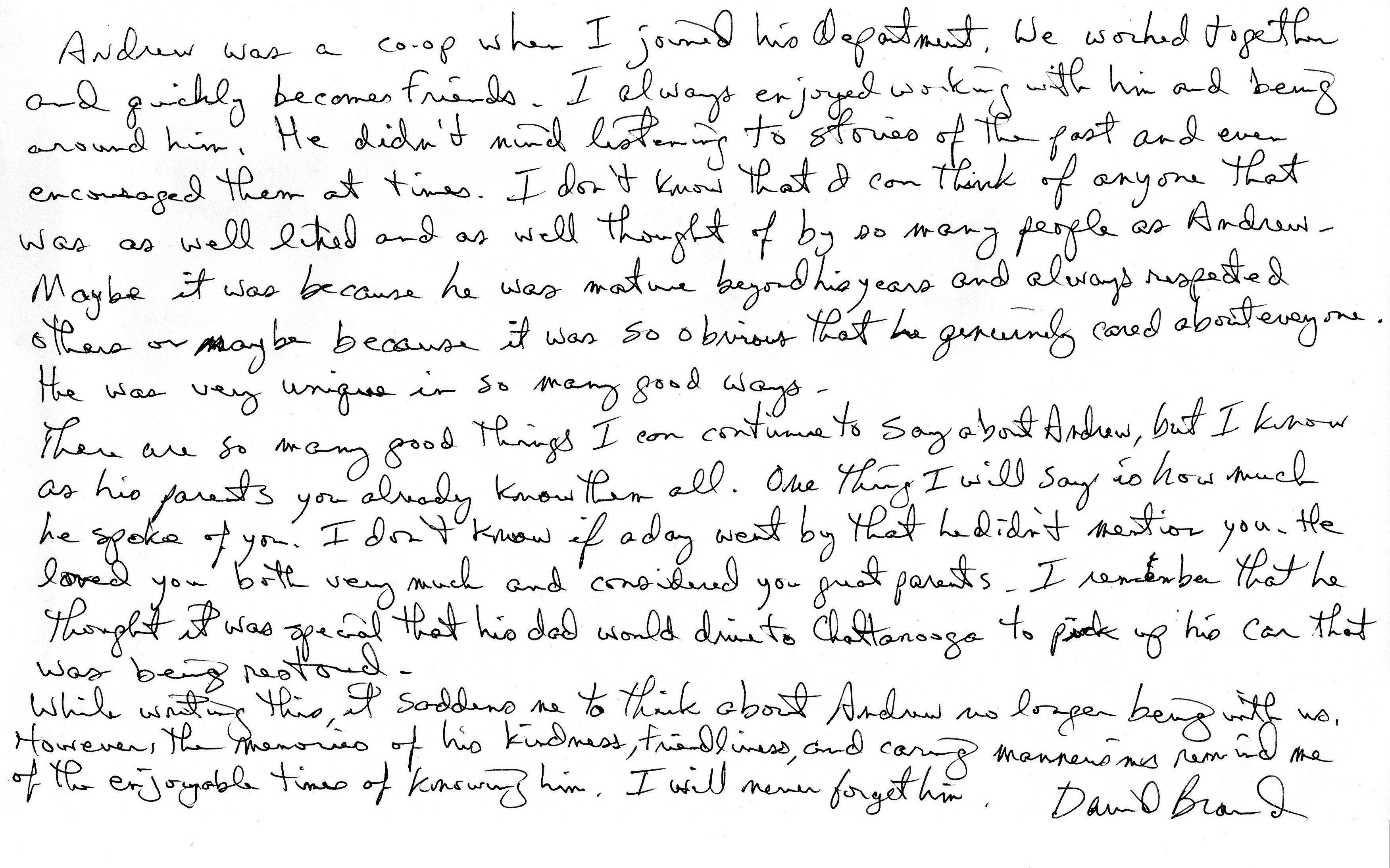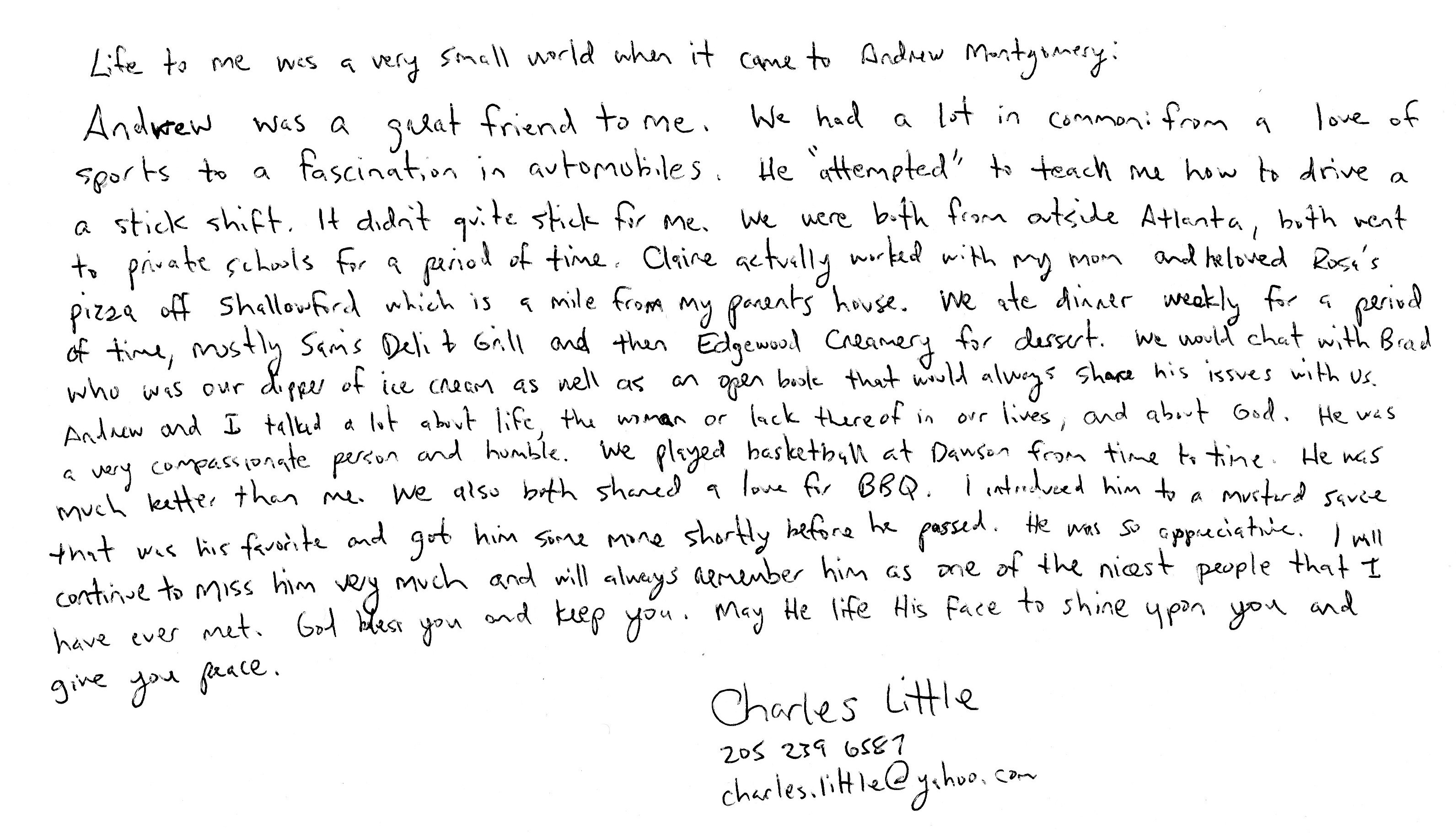 | This Web site - LoveToAndrew.com - was inspired by the "memory book" put together by Andrew's coworkers at Southern Company. We his parents, Mary Elizabeth and Andy Montgomery, hope that this site brings comfort to Andrew's friends and family members as it has to us. The memories in this book reveal that Andrew was a blessing to many. If you desire to comment or offer postings for the site, please email AndyMont@awmLAND.com or MESloop@awmLAND.com. |